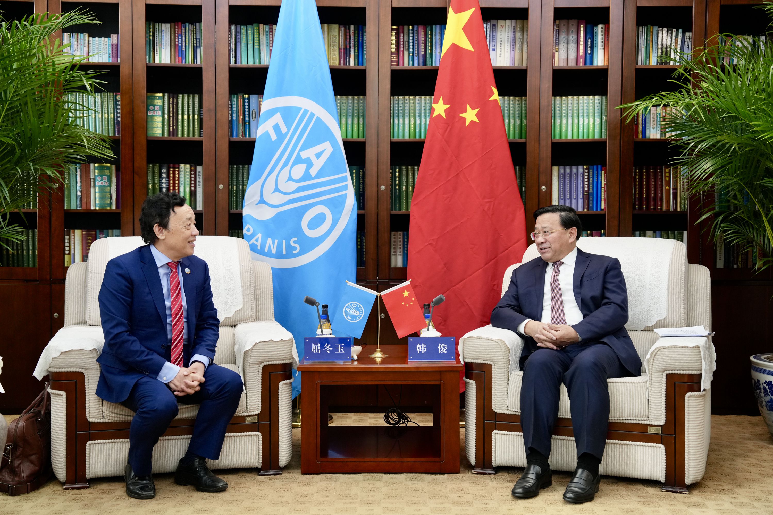 1月8日上午,農業農村部部長韓俊在京會見來訪的聯合國糧農組織總干事屈冬玉。